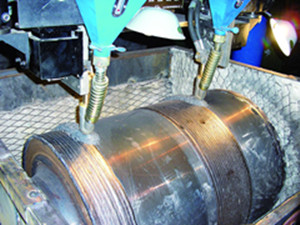 冷轧支撑辊是主要的备件之一,磨损比较大,根据磨损情况,采用埋弧堆焊层硬度合金,提高了辊的耐磨性,延长了使用寿命,节约了大量资金。